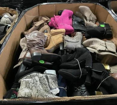 Gran selección de calzado para hombres, mujeres y niños. Los lotes pueden incluir una mezcla de calzado deportivo, zapatos de vestir, calzado casual, tenis, sandalias, botas de trabajo y más. Las marcas pueden incluir Jessica Simpson, Lucky Brand, Steve Madden, Vince Camuto, Marc Fisher, Birkenstock, Crocs, entre otras.